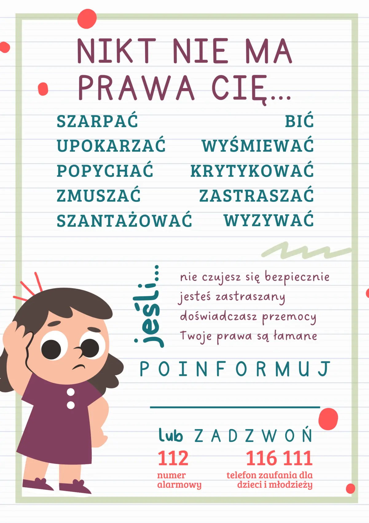 - 800-12-12-12 – całodobowy Dziecięcy Telefon Zaufania Rzecznika Praw Dziecka;